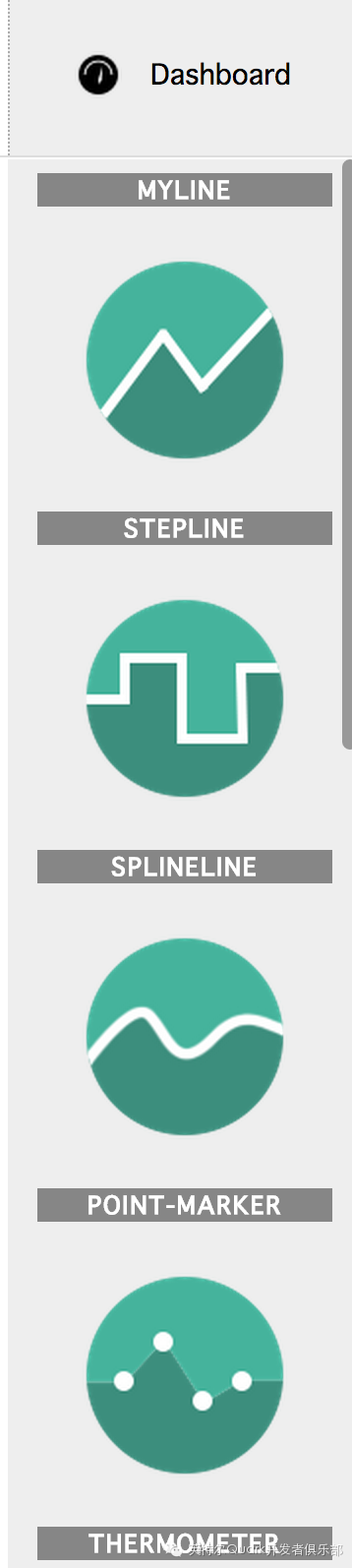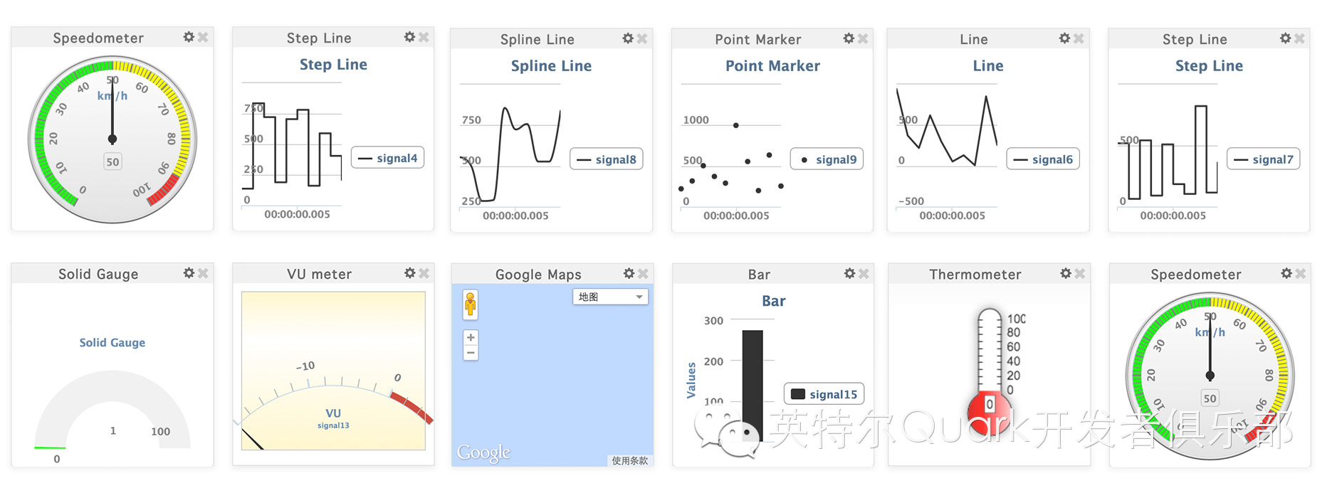 点击页面右侧的Dashboard,即可看到上图中的各种表格,点击图标后则会显示下图中的示例图表。诸如简单地线状图、柱状图、点阵图还有仪表盘,甚至加入了Google Map功能,通过GPS实现些有趣的应用。